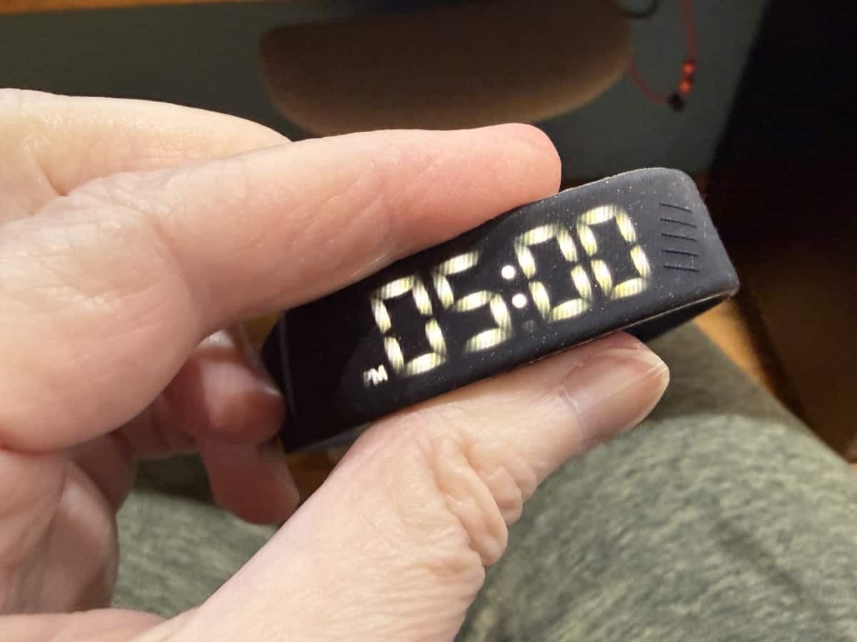There are three alarm slots (A1, A2, A3). If an alarm shows “OF” it’s turned off, which is a small display quirk that took me a minute to understand. Once configured, alarms vibrate the motor on your wrist, and a single press of the button stops the vibration.