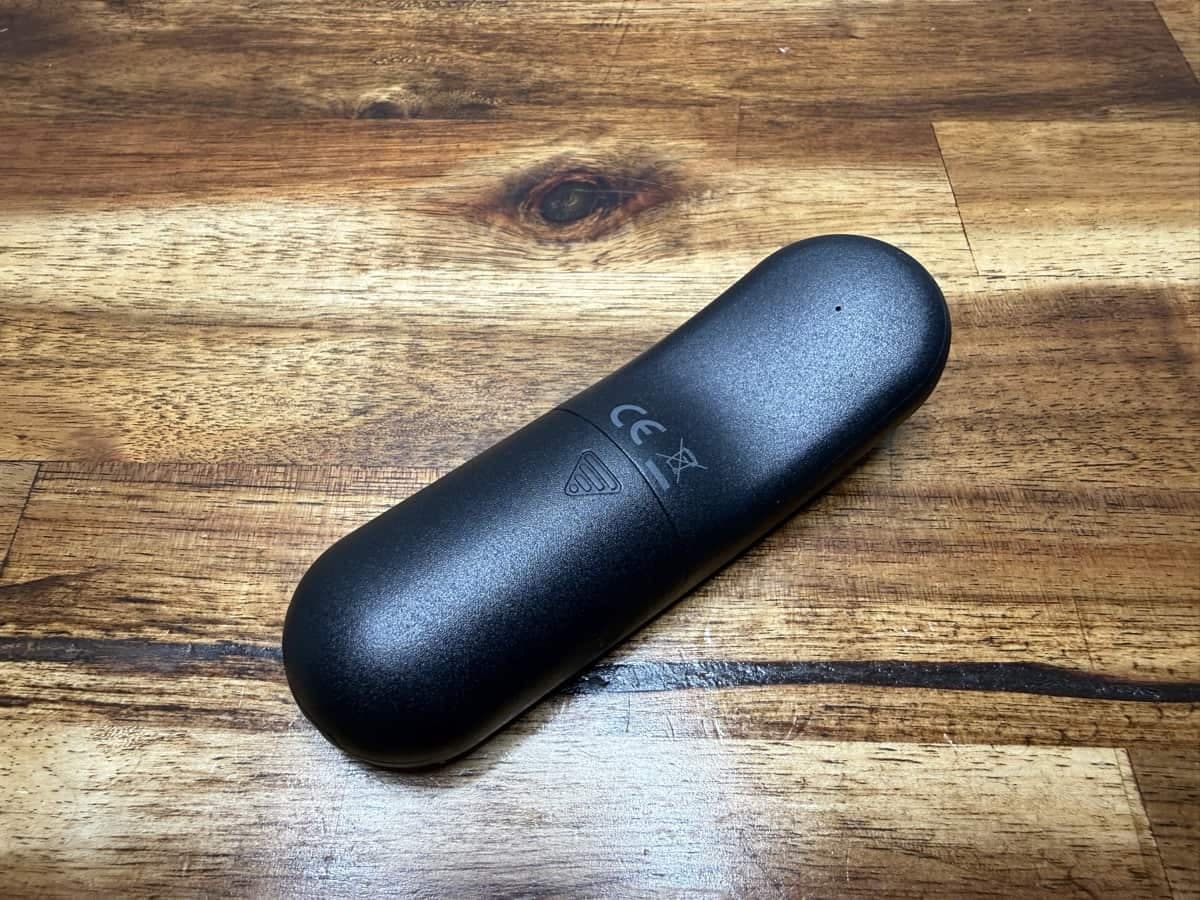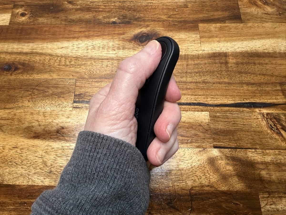 Ergonomically it’s a win. The remote is small, comfortable in the hand, and has a thumb indentation that naturally centers your thumb over the large forward button. The tactile feedback is pleasant with enough click to be satisfying without being loud or fatiguing over long sessions.
