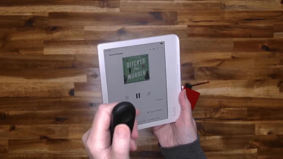 The Kobo remote can also be used for audiobooks, but it behaves differently than standard play/pause remotes. With an audiobook playing through a paired Bluetooth speaker or earbuds, the big and small page buttons skip forward or back by roughly 30 seconds rather than toggling play/pause. To stop playback you still need to touch the e-reader screen. It works, but it’s not a full-featured remote for audiobook controls.